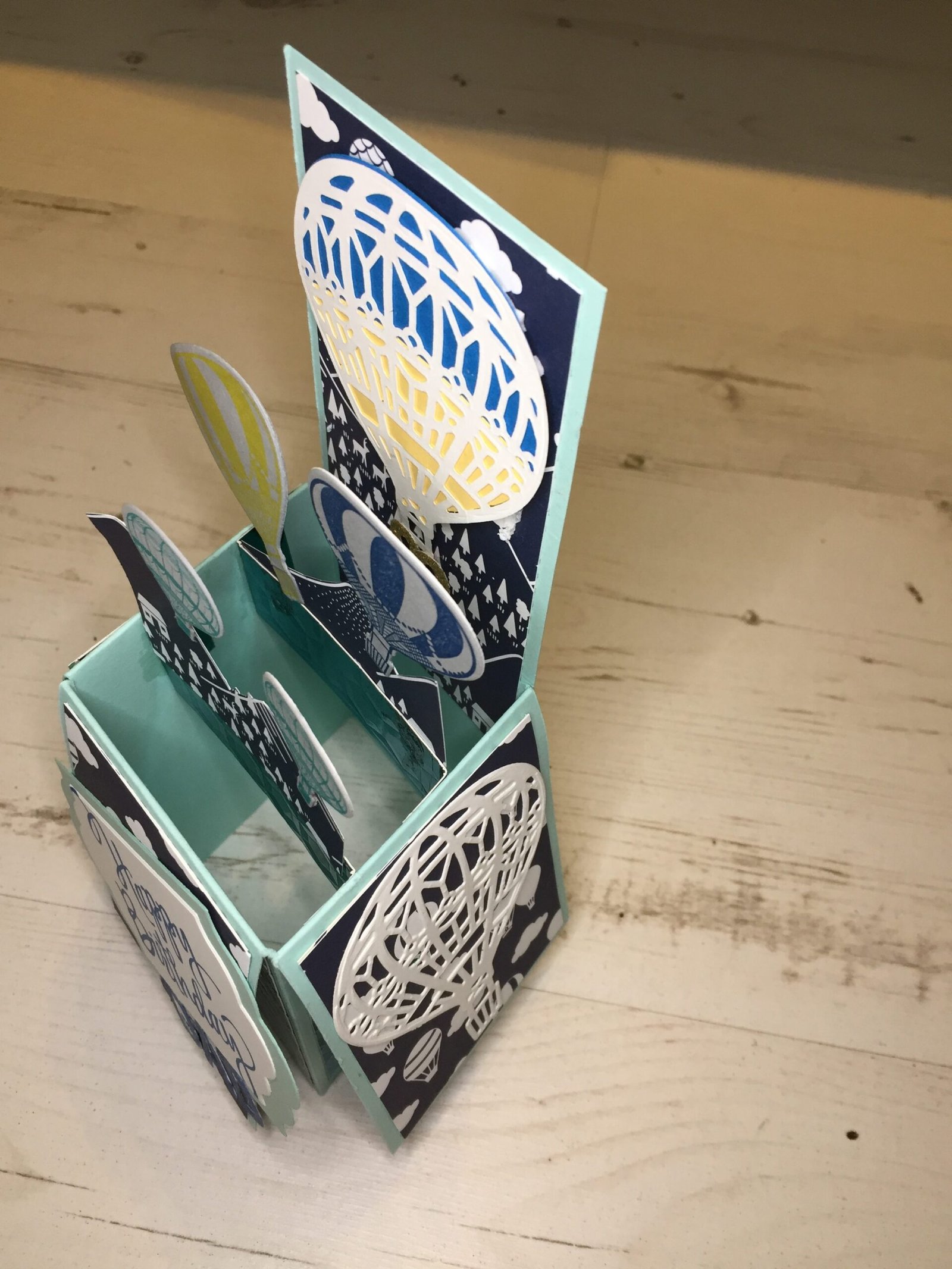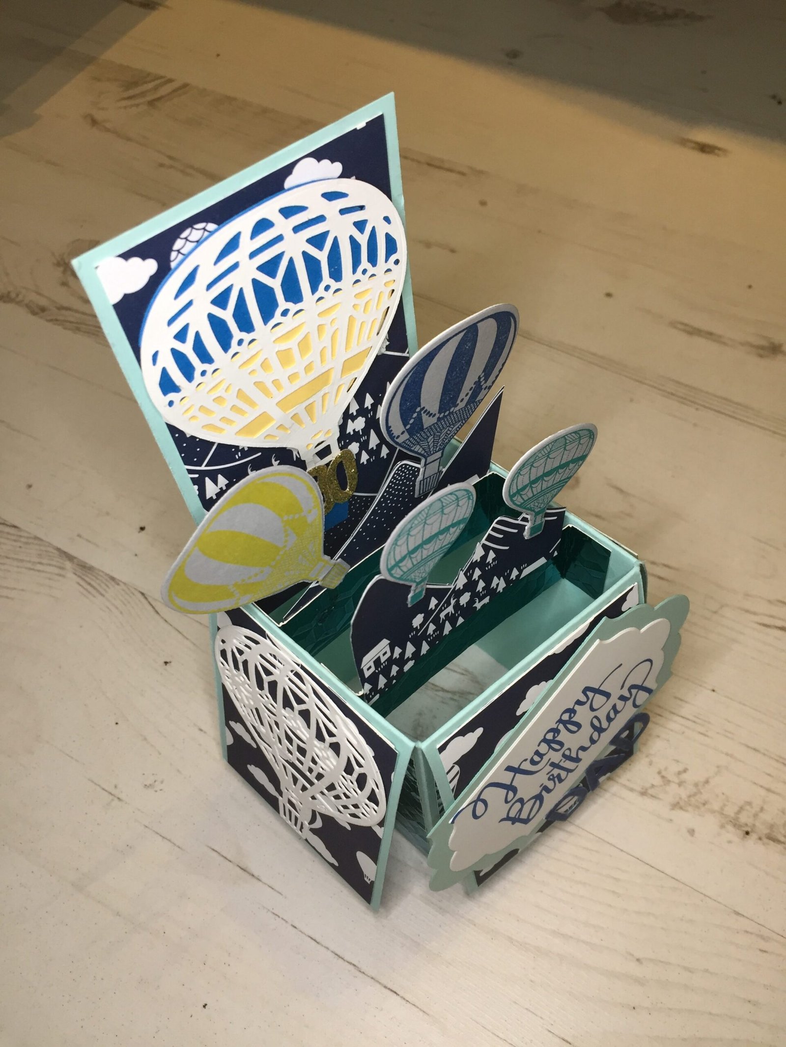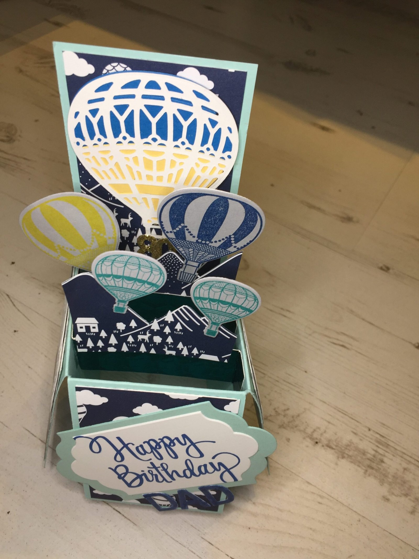 Today I am able to share what I think is an Eye popping Card in a Box Hot Air Balloonst hat I made for my Dad’s 80th Birthday and which I gave to him yesterday.