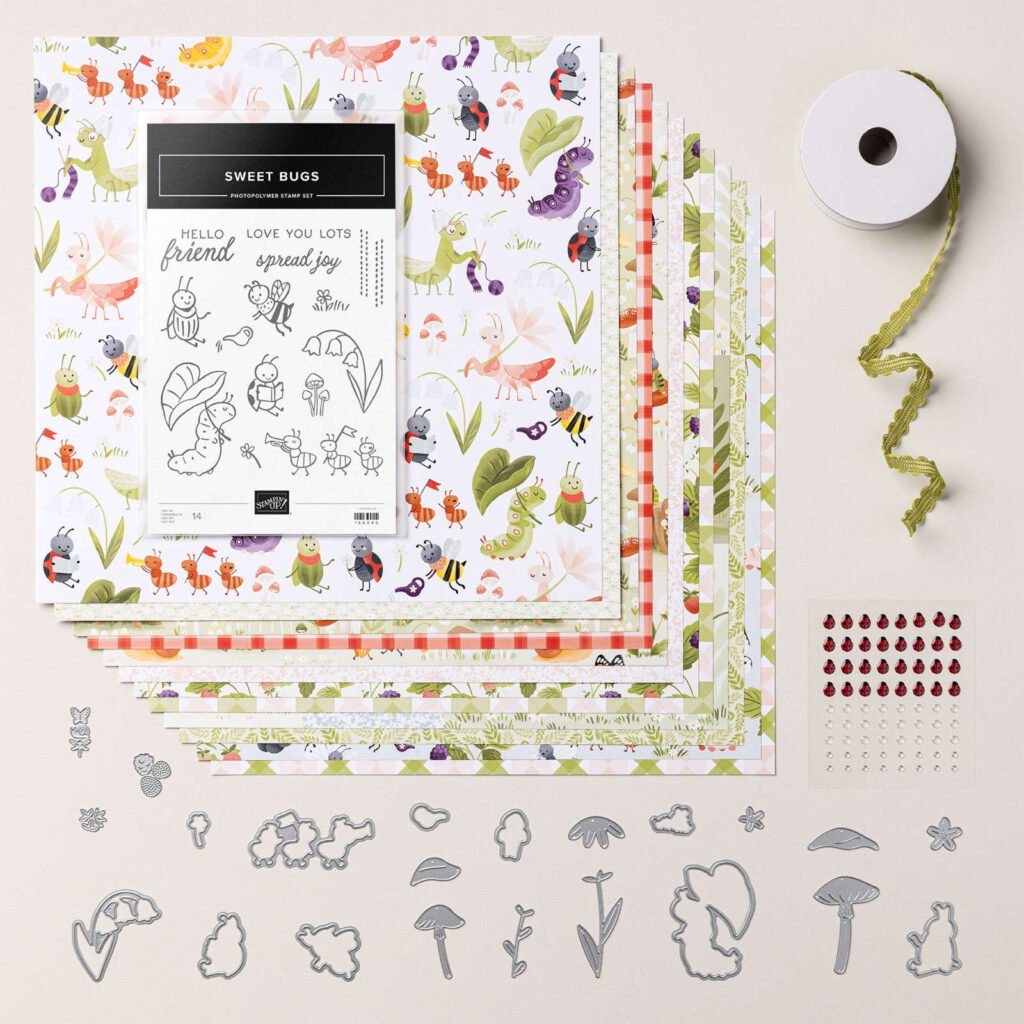 - Card stock, Sweet Bug stamp set and dies, Cute as a Bug Designer Series Paper as well as adhesive.