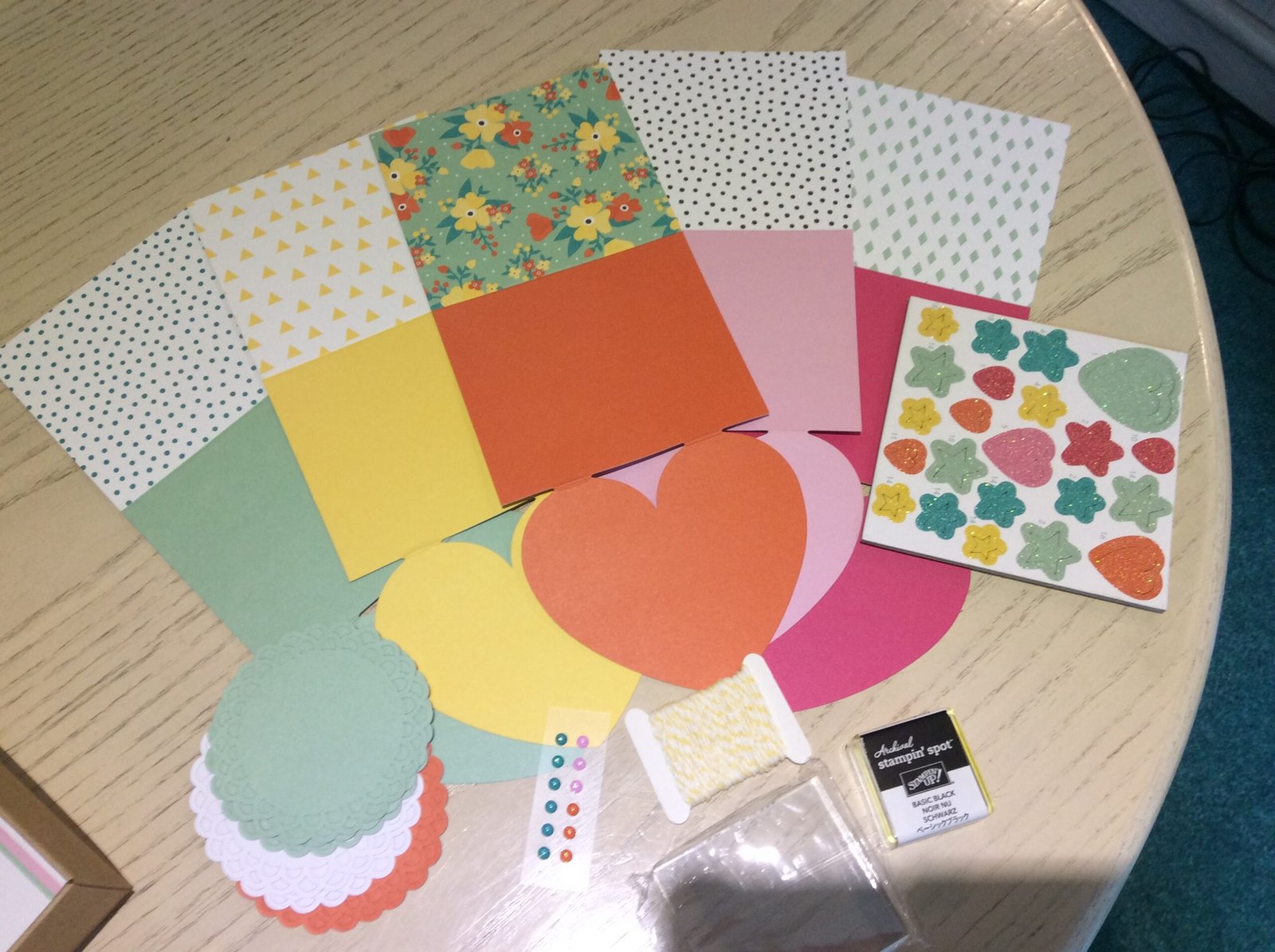 Hi Everyone, welcome to StampingwithFiona, this is very exciting as I’m taking part in my first ever blog hop, the Stampin’ Stars and Twinklets Blog Hop. As I mentioned previously I’ve had a lot of work done on my craft room and I had to move everything out so I’ve struggled to craft for a couple of weeks. Luckily I had had the opportunity to make an advance purchase as a Stamping’ Up! demonstrator and one of the things I had chosen was the new kit in the brand new 2016 – 2017 Annual Catalogue. the Oh Happy Day Card Kit (*142725). Its great and it includes so much; a set of stamps, a Stamping Spot in Basic Black, a selection of card bases and envelopes as well as cutouts, dimensional and even some twine and beautiful glittered dots.